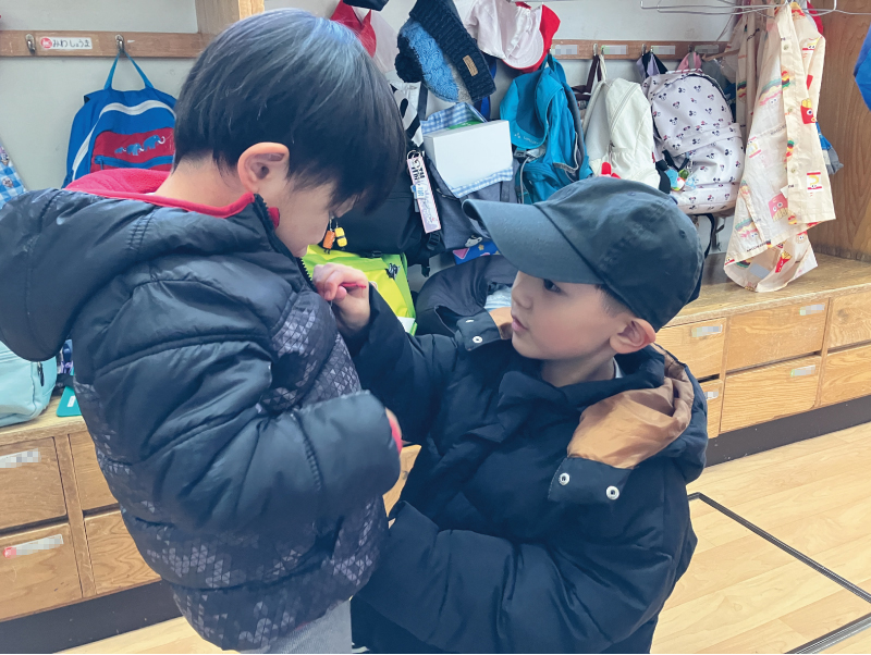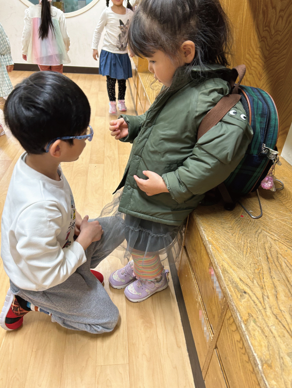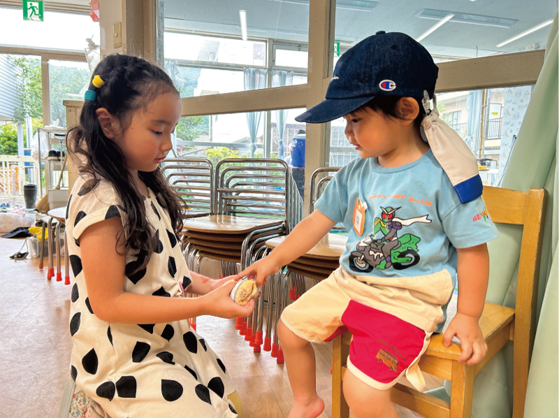 年少児・年中児・年長児が同じクラスで生活する中で、年下の子どもたちは年上の子どもたちから愛され、かわいがられた経験をすることで、自分が年上になったときに年下の子に愛を向けるようになります。子どもたちの中で「愛情のリレー」が育まれます。