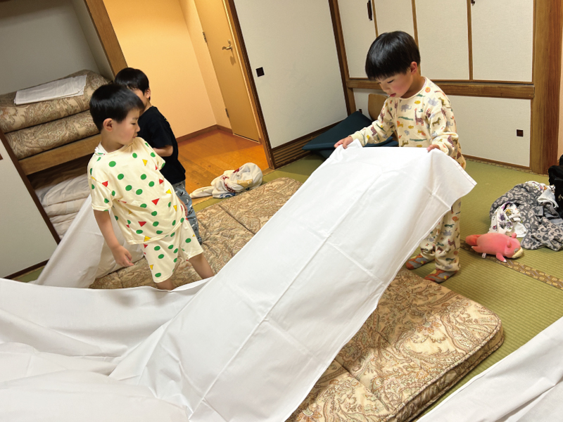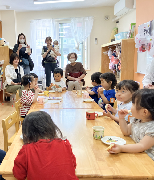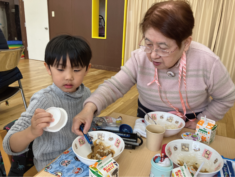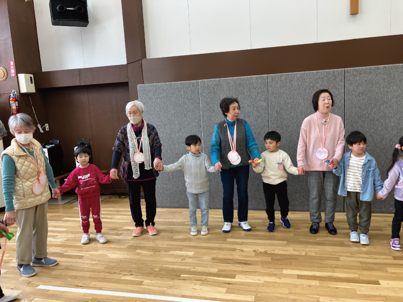 年少児・年中児・年長児が同じクラスで生活する中で、年下の子どもたちは年上の子どもたちから愛され、かわいがられた経験をすることで、自分が年上になったときに年下の子に愛を向けるようになります。子どもたちの中で「愛情のリレー」が育まれます。